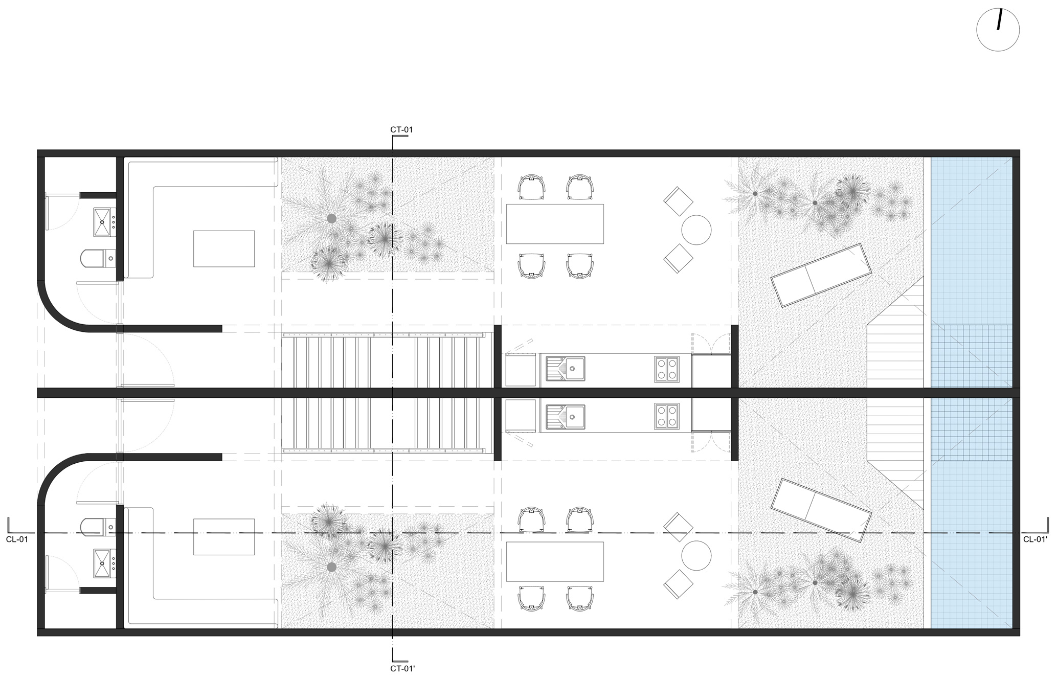 Ubicadas a unos metros dela playa, en un terreno de 10 x 20 metros, el proyecto consiste en dos casa gemelas y espejeadas, con un sistema estructural a base de muros de carga quenos permite una fluidez espacial continua. Los elementos horizontales, de concreto, son de acabado aparente mientras que los muros se aplanarán con pasta tipo Chukum roja.