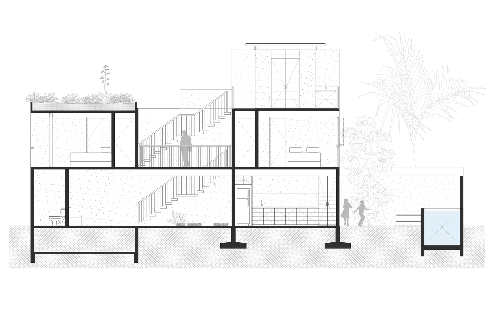 En la planta baja se encuentran los espacios comunes sobre los cuales flotan las dos habitaciones, permitiendo una buena separación entre lo público y lo privado,un patio interno permite una buena iluminación y genera amplitud en los espacios. En el tercer piso se encuentra una terraza desde el cual se pueden apreciar los atardeceres.